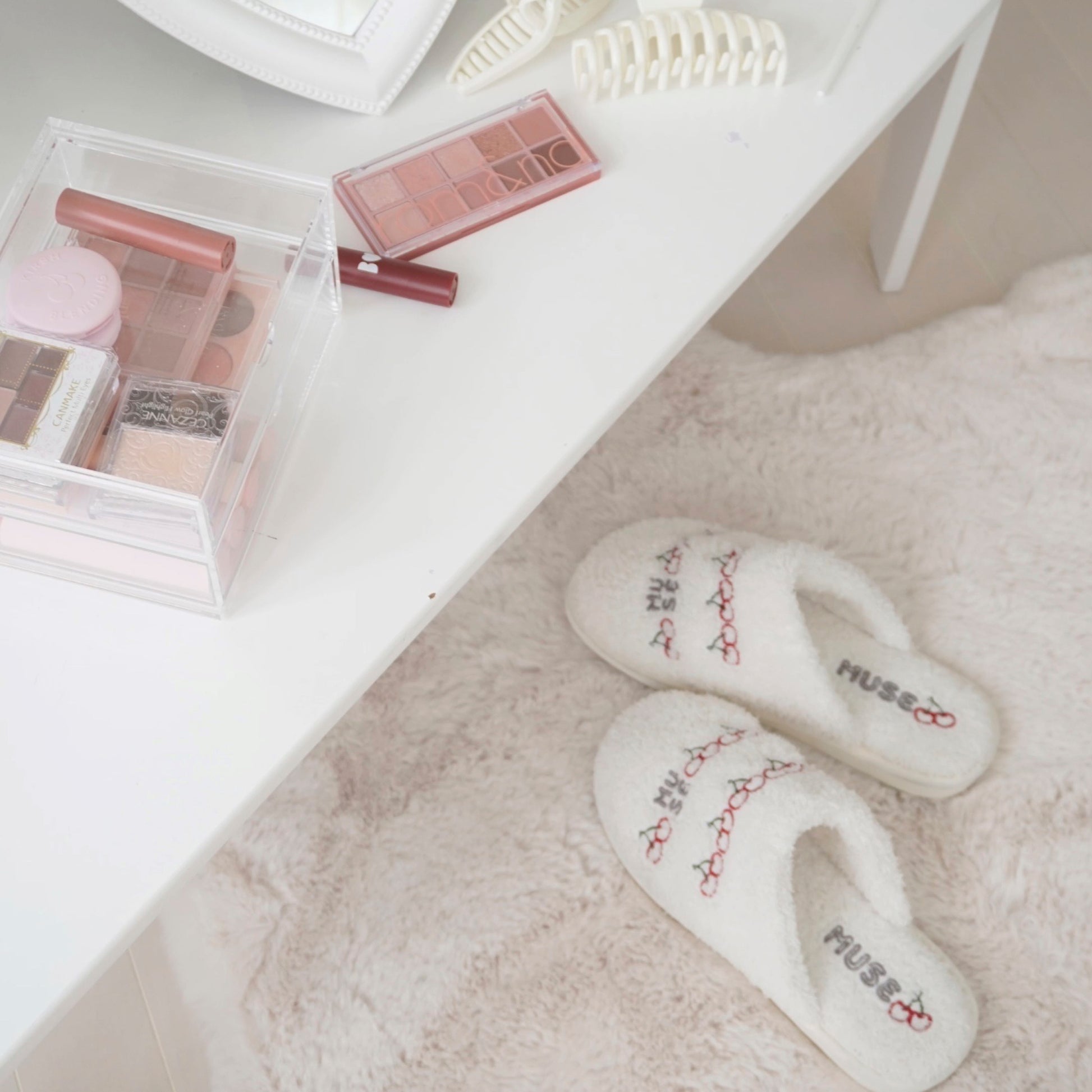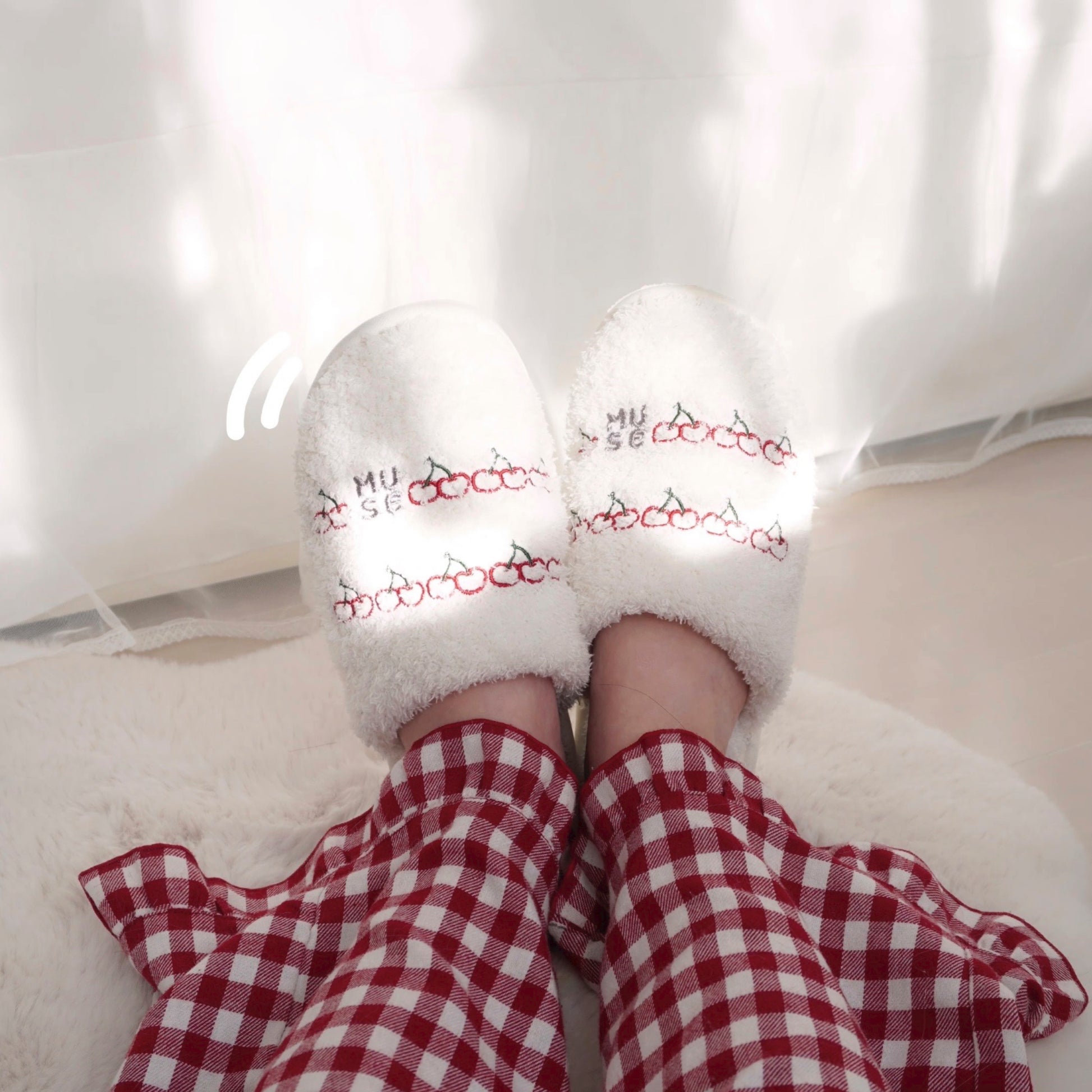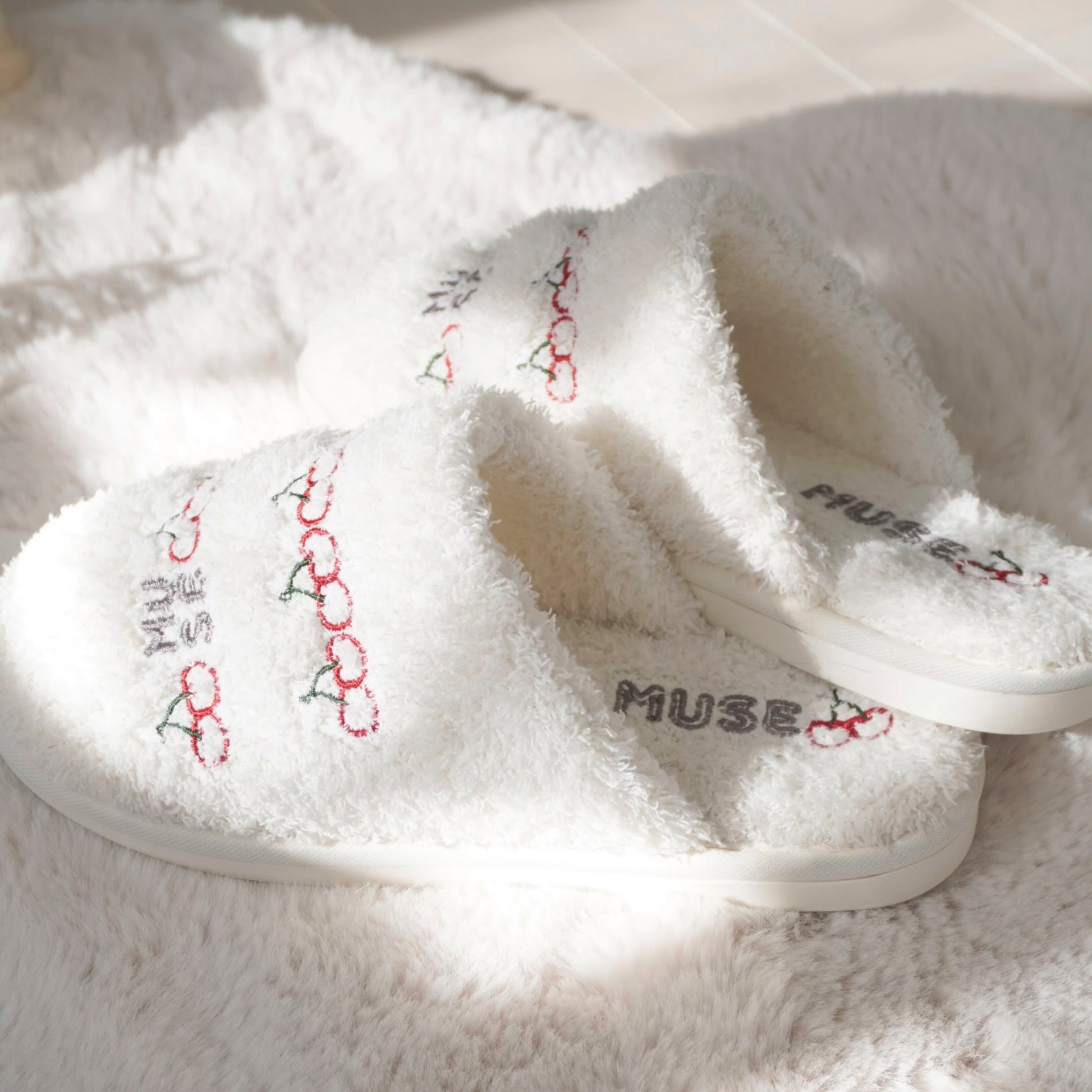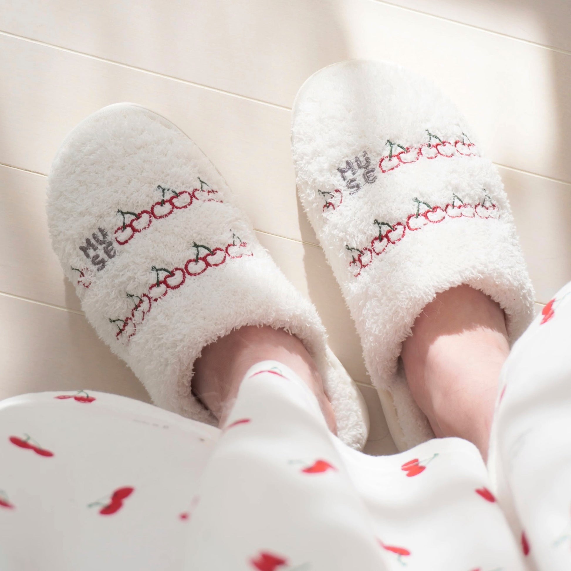 MUSEロゴとさくらんぼがデザインされたルームシューズ。
